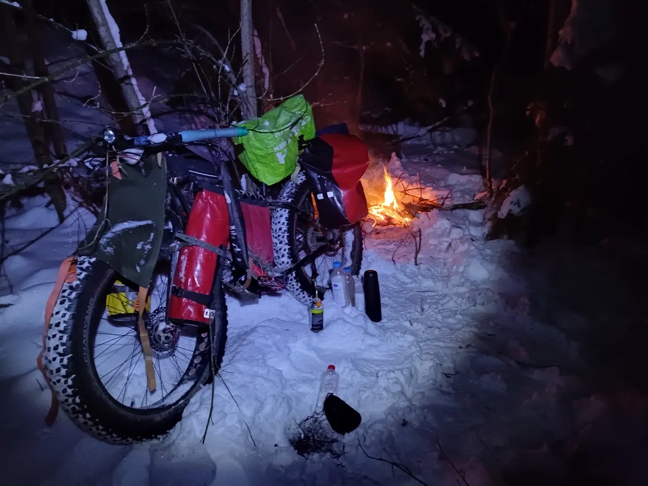 Поездка в общем-то без особого велосипедного героизма - чисто выехал переночевать в лесу, пожечь костер, поспать в палатке. Походил и поездил через засыпанные снегом СНТ. Вполне удалось избежать автомобильных дорог, траффика и помесить снег. Пока еще даже лопата не нужна при установке палатки. Вообще не пользовался примусом, еду варил на костре.
